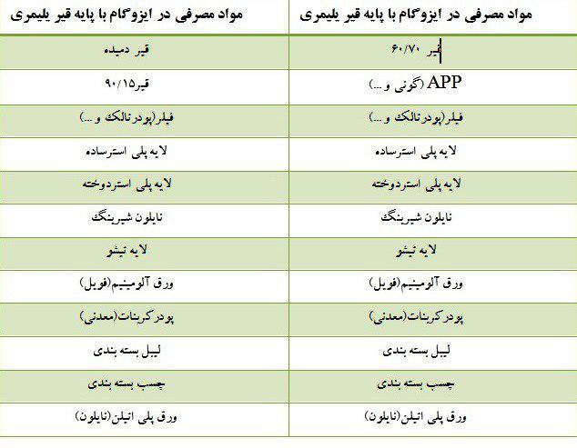 در ايزوگــــام با پـايه قير پليمري عمدتاً از قير 70/60 و يا 100/85 به عنوان شيره قير مورد استفـــاده قرار مي گيرد در حالي كه در ايزوگام با پايه قير دميده عمدتاً از قير هاي 10/110 R و 15/90 R استفاده مي شود